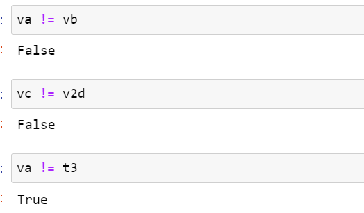 즉, 위의 테스트에서 사용한 객체들에 대한 != 연산자는 다음과 같이 일관된 결과를 반환합니다.
