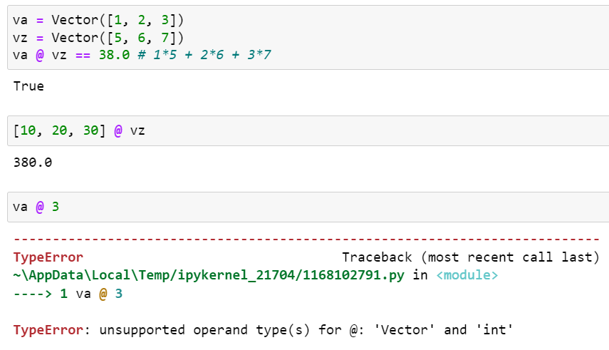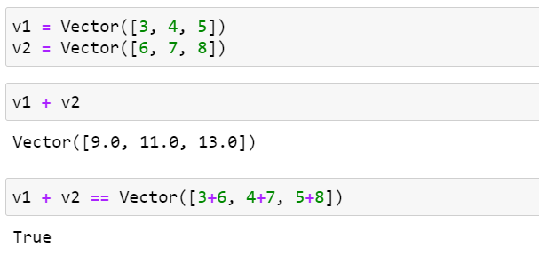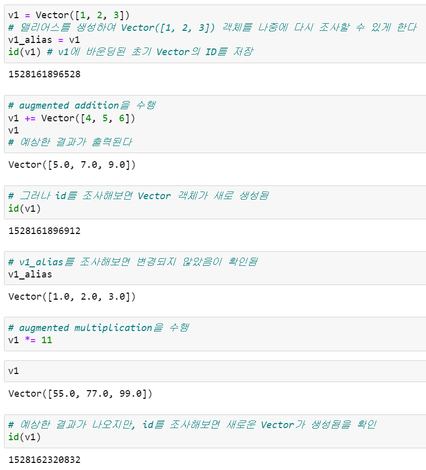 지금까지 구현한 Vector 클래스는 이미 +=와 *= 복합 할당 연산자(Augmented Assignment Operator)를 지원하고 있습니다. 아래 예제 코드에서 이를 확인해보도록 하겠습니다.