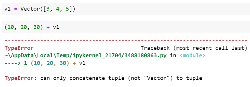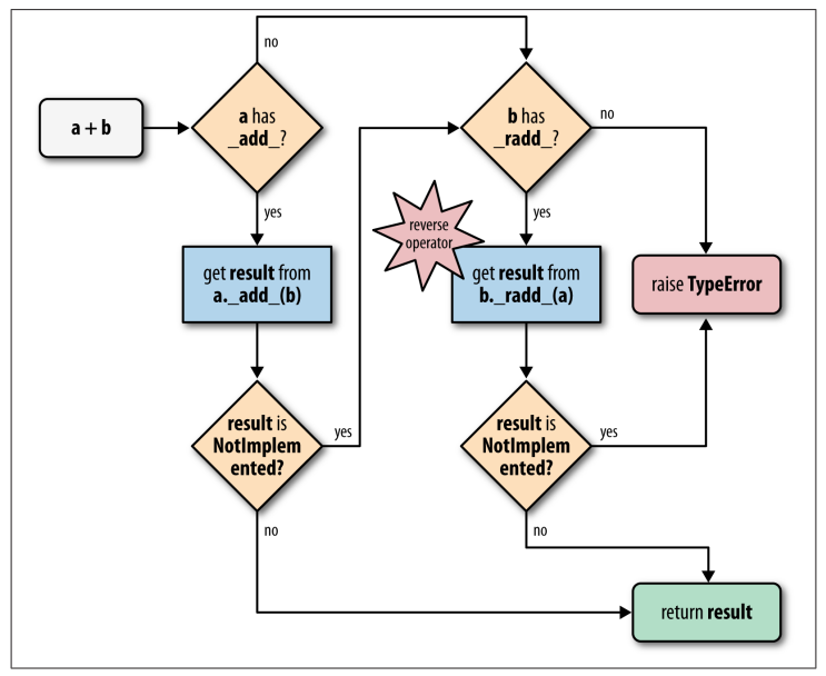 구조적으로 AddableBingoCage에는 __radd__()가 구현되어 있지 않습니다. 이는 이 메소드가 필요없기 때문입니다. 정방향 메소드 __add__()는 오른쪽에도 동일한 자료형이 와야 작동하므로, AddableBingoCage인 a와 AddableBingoCage가 아닌 b를 이용해서 파이썬이 a + b를 계산하면 NotImplemented를 반환하므로 b 객체의 클래스가 이 연산을 처리할 수 있습니다. 그러나 표현식이 b + a이고, b가 AddableBingoCage가 아니며 NotImplemented를 리턴한다면 파이썬이 b 객체를 처리할 수 없기 때문에 TypeError를 발생시키고 포기하는 것이 낫습니다.
