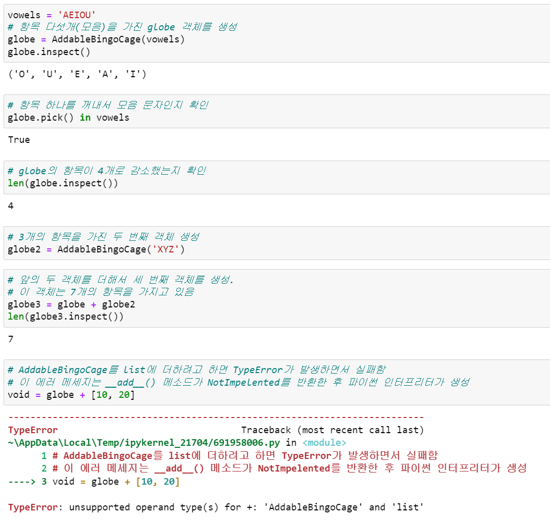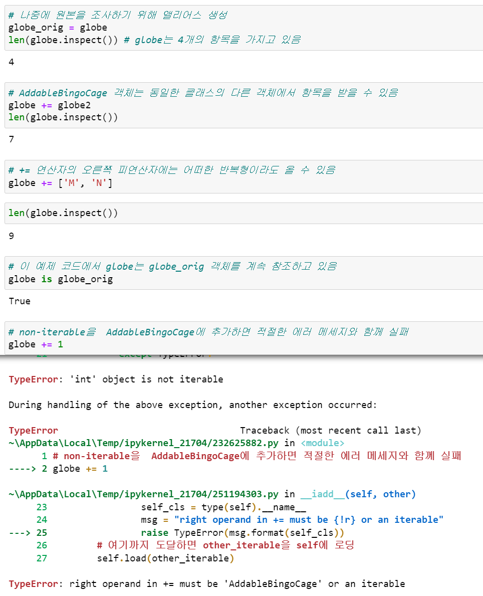 AddableBingoCage는 가변형이므로 다음 예제 코드에서 __iadd__()를 직접 구현했을 때 어떻게 동작하는지 보여줍니다.