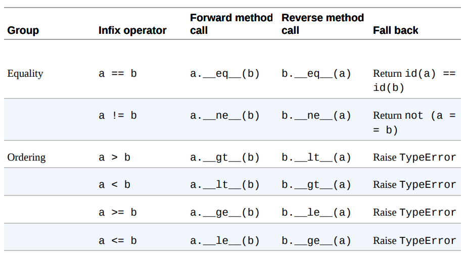 - == 연산자의 경우 특별히 reverse 메소드가 NotImplemented를 반환하면, 파이썬 인터프리터는 최후의 수단으로 두 객체의 ID를 비교한다