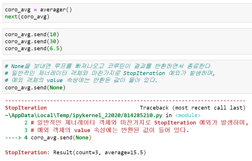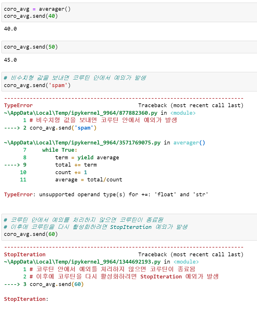 코루틴 안에서 발생한 예외를 처리하지 않으면, next()나 send()로 코루틴을 호출한 호출자에 예외가 전파됩니다. 아래 예제 코드는 @coroutine으로 데코레이트된 averager 코루틴을 사용한 예를 보여줍니다.