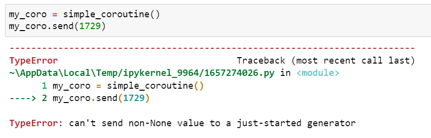 코루틴을 객체를 생성하고 난 직후에 바로 None이 아닌 값을 전달하려고 하면 다음과 같은 에러가 발생합니다.