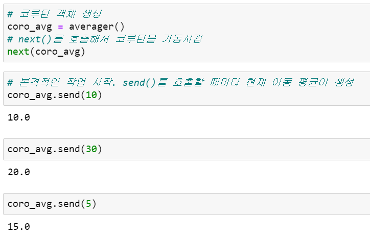 # 이 yield문은 코루틴을 중단하고, 지금까지의 평균을 생성하기 위해 사용