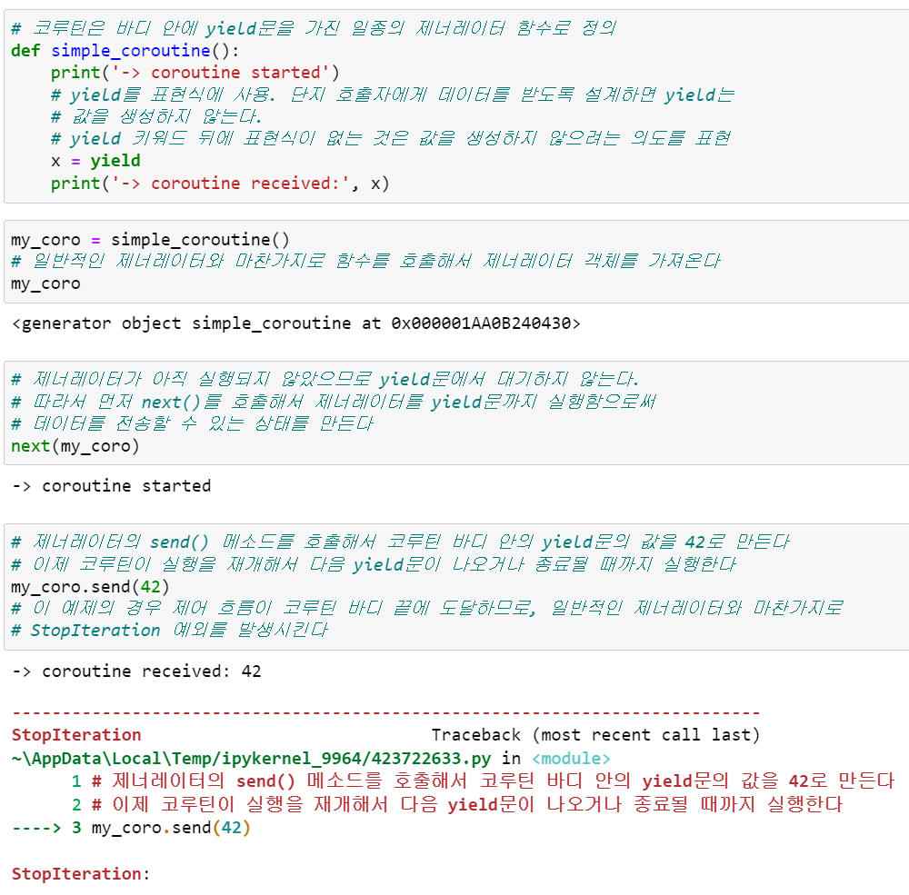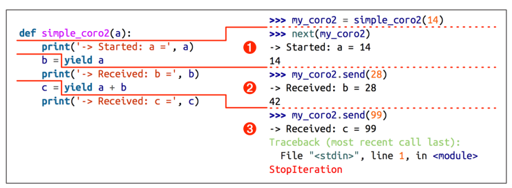 파이썬 코루틴은 본질적으로 .send(...) 메소드를 호출하는 제너레이터입니다. 코루틴에서 'to yield'의 본질적인 의미는 양보한다는 것입니다. 즉, 제어를 프로그램의 다른 부분에 넘겨주고, 다시 시작하라고 알려줄 때까지 기다립니다. 호출자는 my_coroutine.send(datum)을 호출하여 코루틴에게 데이터를 넘겨줍니다. 그럼 코루틴은 다시 재개되고 중단된 곳에서 datum을 yield 표현식의 값으로 받습니다. 일반적인 용법에서, 호출자는 이 방법을 통해 반복적으로 데이터를 밀어 넣습니다. 제너레이터와 반대로, 코루틴은 보통 데이터를 소비하며, 생산하지 않습니다.