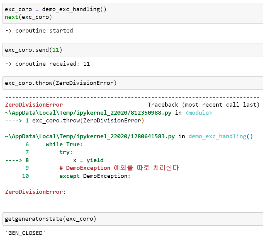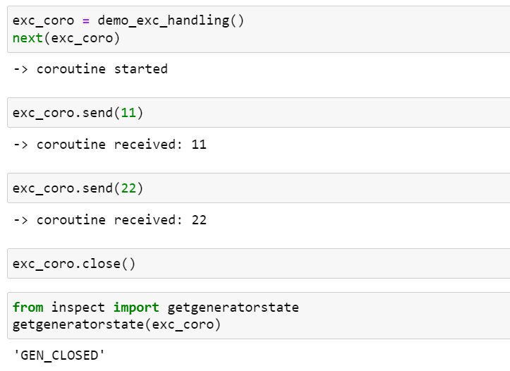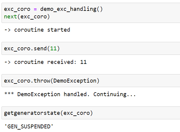 파이썬 2.5 이후 제너레이터 객체는 호출자가 코루틴에 명시적으로 예외를 전달할 수 있게 해주는 throw()와 close() 메소드를 제공합니다.