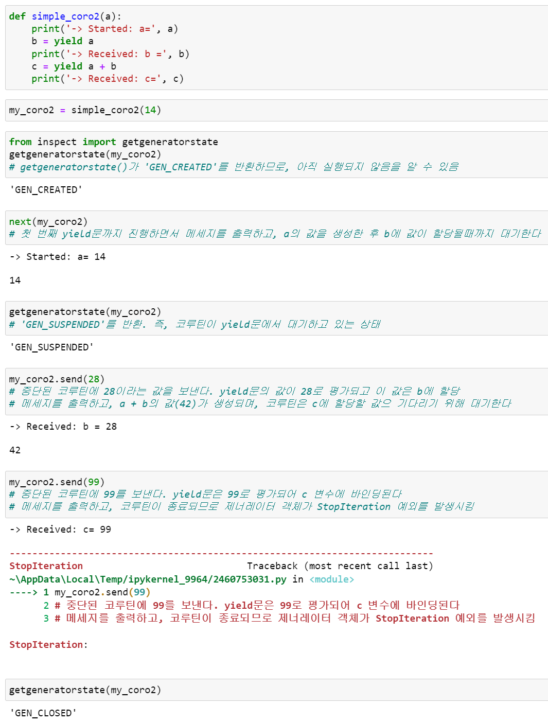 - my_coro2.send(28)은 28을 b에 할당하고, 두 번째 메세지를 출력한 후 yield a+b까지 실행되어 숫자 42를 반환