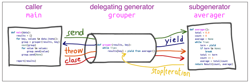 예제 코드에서 group.send(None) 구문이 중요합니다. None을 전송해야 현재의 averager() 객체가 종료되고 다음번 객체를 생성하게 됩니다. 이 코드를 제거하면 실행해도 아무것도 출력되지 않습니다. None이 전달되지 않았으면, 내부 루프가 끝났을 때 grouper() 객체는 여전히 yield from에 멈춰있으므로, grouper() 바디 안에서 results[key]에 대한 할당은 아직 실행되지 않습니다. 바깥쪽 for 루프가 이렇게 끝나고 다시 반복하면, 새로운 grouper() 객체가 생성되어 group 변수에 바인딩됩니다. 기존 grouper() 객체는 더 이상 참조되지 않으므로 가비지 컬렉트됩니다. 이때 아직 실행 종료되지 않은 averager() 서브 제너레이터 객체도 가비지 컬렉트됩니다.