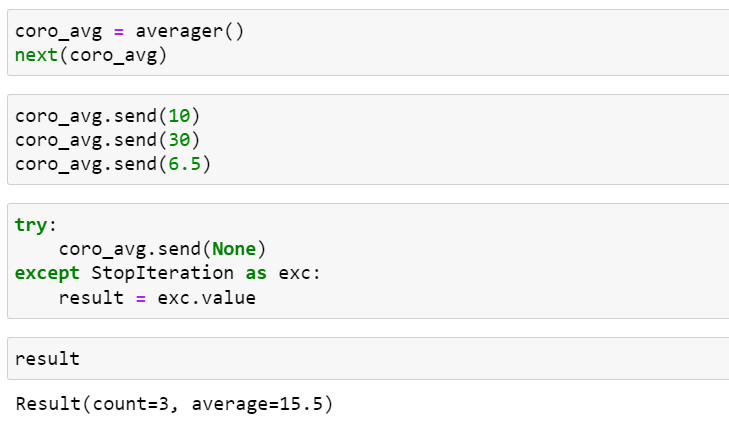 코루틴을 사용하면 total과 count를 지역 변수로 사용할 수 있다는 장점이 있습니다. 객체 속성이나 별도의 클로저 없이 평균을 구하는 데 필요한 값들을 유지할 수 있습니다. 아래 예제 코드는 averager() 코루틴을 활용하는 방법을 보여줍니다.