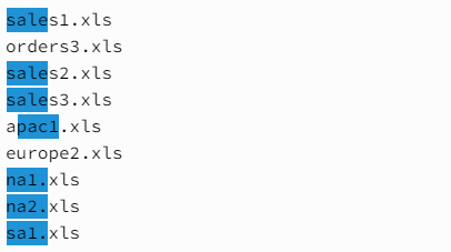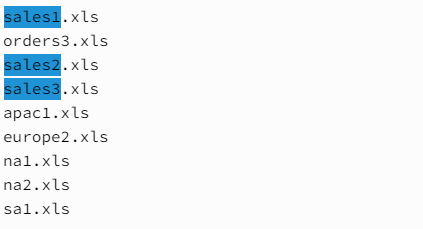 위의 예문에는 sales.xls 파일이 추가되었습니다. 마침표(.) 문자는 어느 문자와도 일치하므로 이 파일 역시 sales. 패턴과 일치합니다.