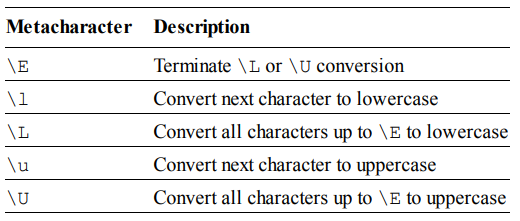 \l과 \u는 바꾸고 싶은 글자 앞에 두어 각각 그 글자를 소문자와 대문자로 변환합니다. \L과 \U는 \E를 만날 때까지 모든 문자를 각각 소문자와 대문자로 변환합니다.