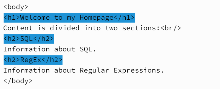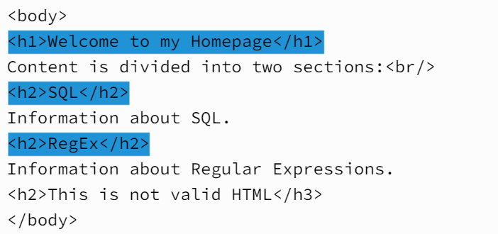 HTML 개발자는 웹페이지에서 헤더 텍스트를 정의하고 만들고자, 헤더 태그를 사용합니다. 헤더 태그는 <h1>부터 <h6>까지 있으며, 이에 대응하는 종료 태그를 함께 사용합니다. 단계에 상관없이 헤더를 모두 찾아야 한다고 생각하면서, 다음 예문을 살펴보겠습니다.