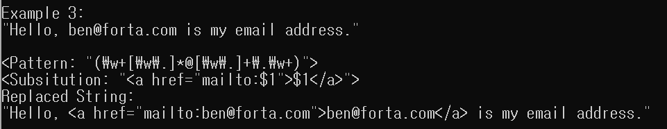 제가 정규표현식 테스트를 위해 사용하는 사이트(link)에서 Substitution 기능을 제공하는데, 사용한 결과는 다음과 같습니다.