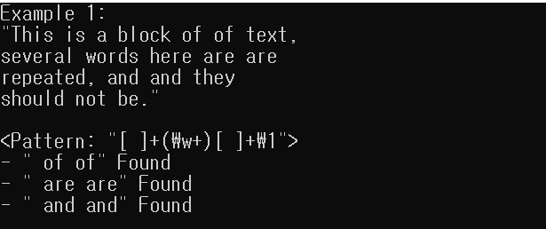 위 예문에서 '[ ]+(\w+)[ ]+\1' 패턴을 사용한 결과는 다음과 같습니다.