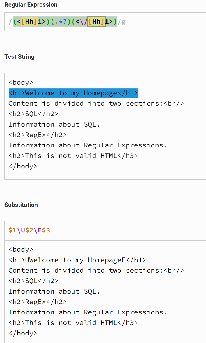 '<[hH][1-6]>'은 모든 헤더의 시작 태그(예제에서는 <h1>와 <h2>)와 일치하고, '<\/[hH][1-6]>'은 모든 헤더의 종료 태그와 일치하여 제대로 동작하는 것처럼 보입니다.