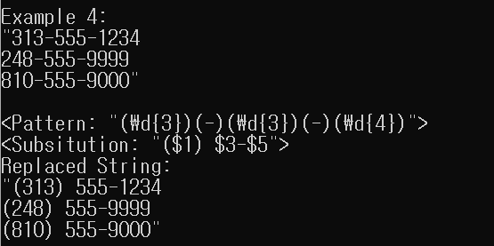 여기서 다시 정규표현식 패턴을 두 개 사용했습니다. 첫 번째 표현식은 '(\d{3})(-)(\d{3})(-)(\d{4})'인데, 이 패턴은 전화번호와 일치합니다. 각 부분을 독립적으로 만들고자 전화번호를 다섯 부분으로 나누었습니다. '(\d{3})'은 첫 하위표현식으로 처음 세 자리 숫자와 일치하고, '(-)'는 두 번째 하위표현식으로 -와 일치하는 식입니다. 결과적으로 전화번호를 다섯 부분으로 나누었고, 각 부분은 하위표현식이라는 것인데, 이 하위표현식들은 지역번호, 하이픈, 처음 세 자리 숫자, 다시 하이픈, 마지막 네 자리 숫자를 가리킵니다. 다섯 부분은 필요에 따라 개별적으로 사용할 수 있으므로, '($1) $3-$5' 패턴은 하위표현식을 필요한 세 개만 사용하고 두 개는 무시하여 간단하게 숫자 형식을 바꿉니다.