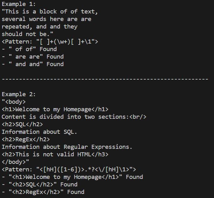 '[ ]+'는 공백이 하나 이상 연속되는 경우와 일치하고, '\w+'는 영숫자 문자가 하나 이상 연속되는 경우와 일치하며, '[ ]+'는 그 뒤에 공백이 있을 때 일치합니다. 여기서 '\w+'를 괄호로 감싸 하위표현식으로 만들었음에 주목합니다. 반복하기 위해서 하위표현식을 사용한 것이 아니며, 반복해서 일치하는 부분도 없습니다. 여기서는 나중에 일치한 부분을 사용할 수 있도록 표시하여 구별하고자 하위표현식을 사용했습니다. 이 패턴의 마지막 부분인 '\1'은 앞서 일치한 하위표현식을 참조한다는 것을 의미하고, 따라서 '(\w+)'와 일치하는 문자는 '\1'과도 일치합니다.