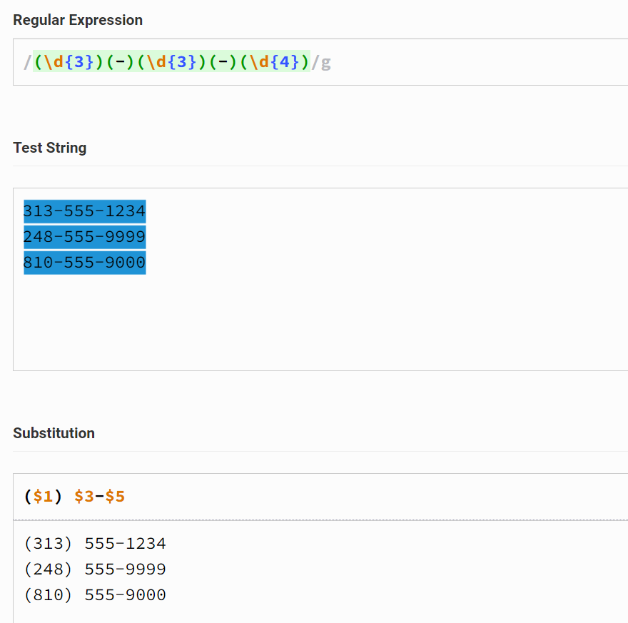 예제를 하나 더 살펴보겠습니다. 이번에는 사용자 정보를 저장하는 데이터베이스에 전화번호가 313-555-1234와 같은 형식으로 저장되어 있으며, 이 전화번호를 (313) 555-1234와 같은 형식으로 변환해야 한다고 가정해봅시다.