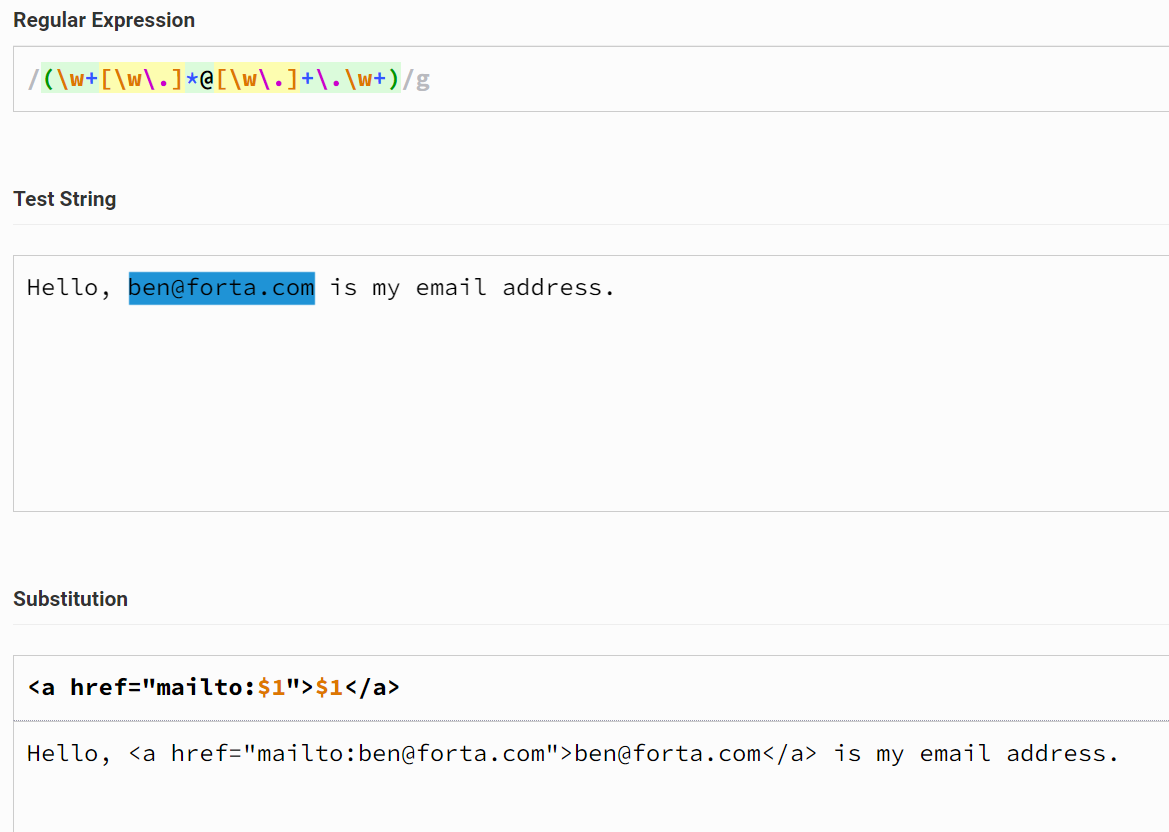HTML에서는 <a href="mailto:user@address.com">user@address.com</a>를 사용해 클릭할 수 있는 이메일 주소를 만듭니다. 정규표현식의 역참조를 사용하면 매우 간단하게 이와 같은 이메일 주소를 클릭이 가능한 주소 형식으로 바꿀 수 있습니다.
