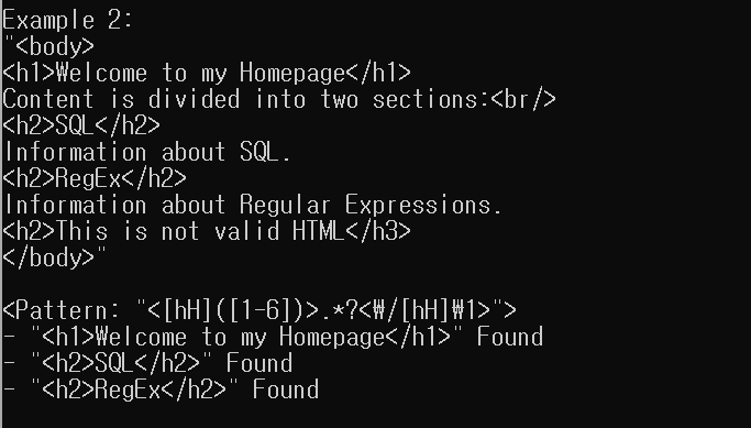 여기서 '.*' (greedy quantifier)이 아닌 '.*?' (lazy quantifier)을 사용했음에 유의합니다. 여기서 만약 '.*'를 사용하여 '<[hH][1-6]>.*<\/[hH][1-6]>' 패턴은 두 번째 줄에 있는 <h1>에서 시작해 여섯 번째 줄에 있는 </h2> 사이의 모든 글자와 일치할 수도 있습니다. 이러한 문제는 '.*?'를 사용해서 해결합니다.