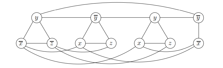 - 각 절마다 절의 리터럴들을 정점으로 하는 삼각형(리터럴이 둘뿐이면 하나의 직선이 됨)을 하나씩 작성하고, 서로 반대인 리터럴을 나타내는 정점들을 모두 간선으로 연결하여 그래프 G를 구축한다.
