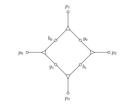 두 명의 소년 \(b_0\)와 \(b_1\) 그리고 두 명의 소녀 \(g_0\)과 \(g_1\)들이 다른 삼자묶음에 속하지 않는다고 가정해봅시다. 그러면 매칭은 (\(b_0, g_1, p_0\))와 (\(b_1, g_0, p_2\))이든지 아니면 (\(b_0, g_0, p_1\))과 (\(b_1, g_1, p_3\))이어야 합니다. 왜냐면 이 두 가지만이 이들 두 소년과 두 소녀가 짝을 지을 수 있는 방법이기 때문입니다. 그러므로 이 장치(gadget, 가젯이라고함)는 가능한 상태가 두 가지밖에 없습니다. 즉, 마치 부울 변수처럼 동작합니다.
