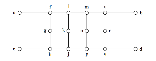 각 쌍 ({a, b}, {c, d})를 제거하기 위해 두 개의 간선을 위의 그림의 가젯으로 대체합니다. C에서 간선 {a, b}가 {c, d} 이외에 또 다른 간선과 쌍을 이룬다면, {a, b}를 {a, f}라는 새로운 간선으로 대체합니다. 단, f는 위 그래프에서 보이는 정점입니다. 이제부터 {a, f}를 경유하는 것은 이전 그래프의 간선 {a, b}를 경유하는 것을 나타냅니다. 비슷한 방법으로 {c, h}는 {c, d}를 대체합니다. \(|C|\)번을 대체하고 나면 치환이 완료됩니다. 즉, 이렇게 얻은 그래프의 루드라타 순회는 C의 제약 조건을 만족하는 원래 그래프의 루드라타 순회와 일대일 대응합니다.