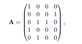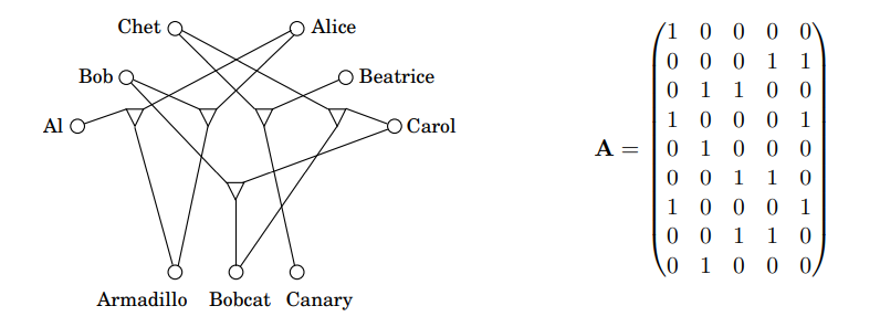 A 행렬의 다섯 개의 열은 가각 5개의 삼자묶음에 대응되며, 9개의 행은 위로부터 차례로 Al, Bob, Chet, Alice, Beatrice, Carol, Armadillo, Bobcat, Canary에 대응합니다.
