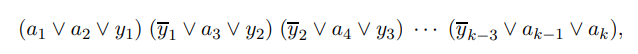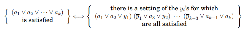 역으로 좌변이 참이면 우변도 참이라는 것을 봅시다. (\(a_1 \vee a_2 \vee \cdots \vee a_k\))가 만족한다는 말은 이 절이 참이 되도록 \(a_1, \cdots, \a_k\)에게 진리값을 부여하는 것이 가능하다는 말이므로, \(a_1 \vee a_2 \vee \cdots \vee a_k\) 중 하나가 true라는 의미입니다. true 값을 배정받은 리터럴을 \(a_i\)라고 가정합시다. 그러면 \(y_1, \cdots, y_{i-2}\)에게는 true를 배정하고 나머지에게는 false를 배정해봅시다. 그러면 우변의 모든 절이 true가 됩니다.
