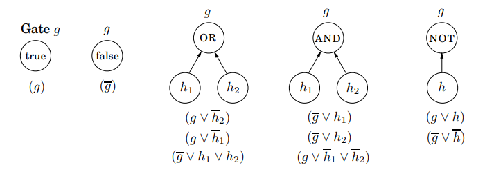 CSAT를 SAT로 치환하는 것도 가능합니다. 즉, CSAT를 구성하는 모든 게이트에 변수를 대입합니다. 그리고 각 게이트의 효과를 다음의 몇 가지 절들을 사용하여 모델링합니다.
