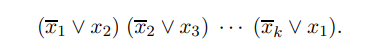 이렇게 변형된 부울식에서는 3번 이상 나타나는 변수는 존재하지 않습니다(사실 두 번 이상 나타나는 리터럴도 없음). 게다가 새로 추가한 식 \((\bar{x}_1 \vee x_2)(\bar{x}_2 \vee x_3)\cdots(\bar{x}_k \vee x_1)\)은 \(x_1, x_2, \cdots, x_k\)가 동일한 값을 갖도록 강제합니다. 따라서 처음 주어진 3-SAT가 true를 가질 수 있는(만족 가능) 필요충분 조건은 위의 제약 조건이 추가된 3-SAT가 만족 가능한 것입니다.