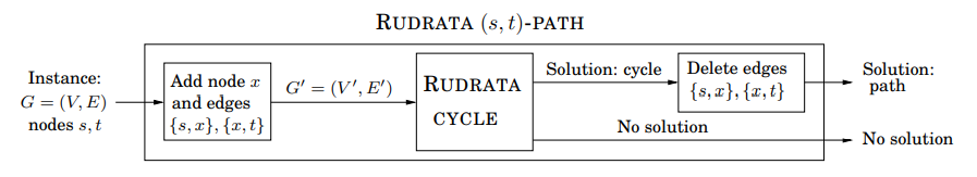 이 치환은 루드라타 경로 문제의 사례(instance) (G = (V, E), s, t)를 루드라타 순회 문제인 G' = (V', E')로 다음과 같이 매핑합니다: G'는 G에 하나의 정점 x, 그리고 이 정점을 끝으로 하는 두 개의 간선 {s, x}와 {x, t}를 추가합니다. 예를 들면 아래의 그림과 같습니다.