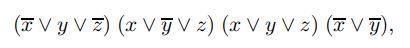3-SAT 문제가 독립집합(Independent Set) 문제로 치환된다고는 생각하기 어려울 수 있습니다. 3-SAT의 입력은 아래와 같이 절(clauses)들의 집합이며, 각 절은 3개 이하의 리터럴(변수)로 구성됩니다.
