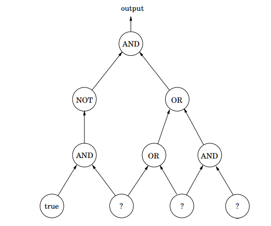 주어진 회로가 true가 되도록 미지의 게이트에 값을 배정하라. 단, 이러한 배정이 불가능하면 불가능하다고 답하라.