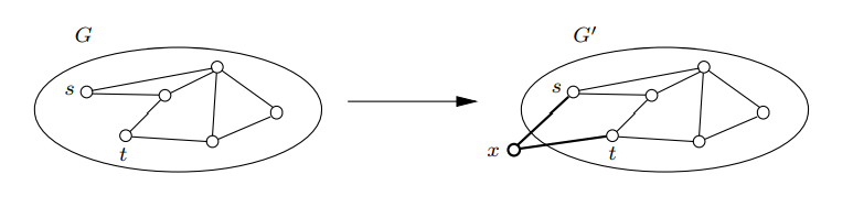 따라서, \(V' = V \cup \{x\}\), \(E' = E \cup \{\{s, x\}, \{x, t\}\}\)가 됩니다.