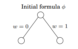 이러한 부울식이 있는 경우에 우리는 부분해의 트리를 확장해나가면서 답을 찾아낼 수 있습니다. 즉, 임의의 변수, 예를 들어, \(w\)를 선택하여 초기 트리를 다음과 같이 둡니다.