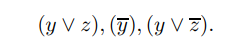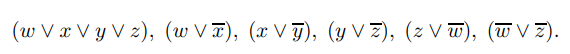 백트래킹을 사용하는 방법을 예를 통해 살펴볼텐데, 다음과 같은 절(clause)들의 집합인 부울식 \(\Phi(w, x, y, z)\)으로 살펴보겠습니다.