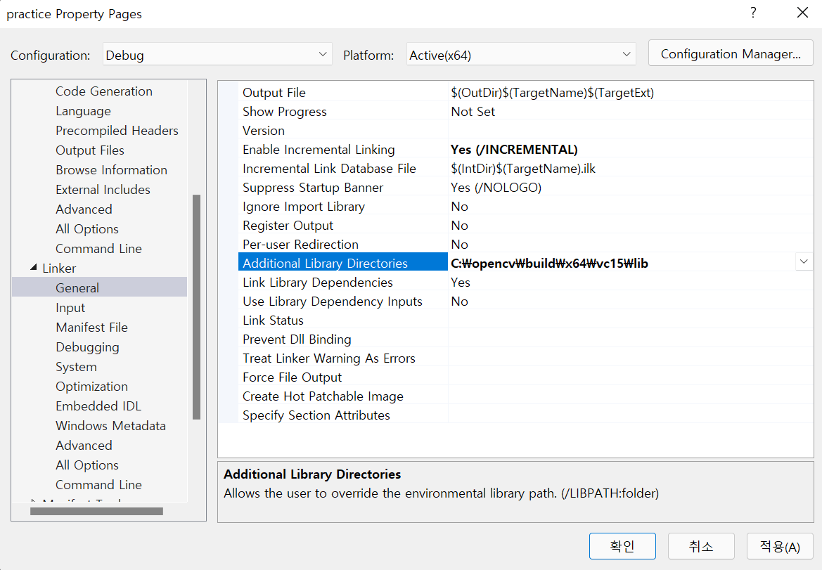 다음으로는 Configuration Properties - Linker - General의 Additional Library Directories에 설치한 opencv 폴더 내 x64/vc15/lib 위치의 경로를 추가합니다.