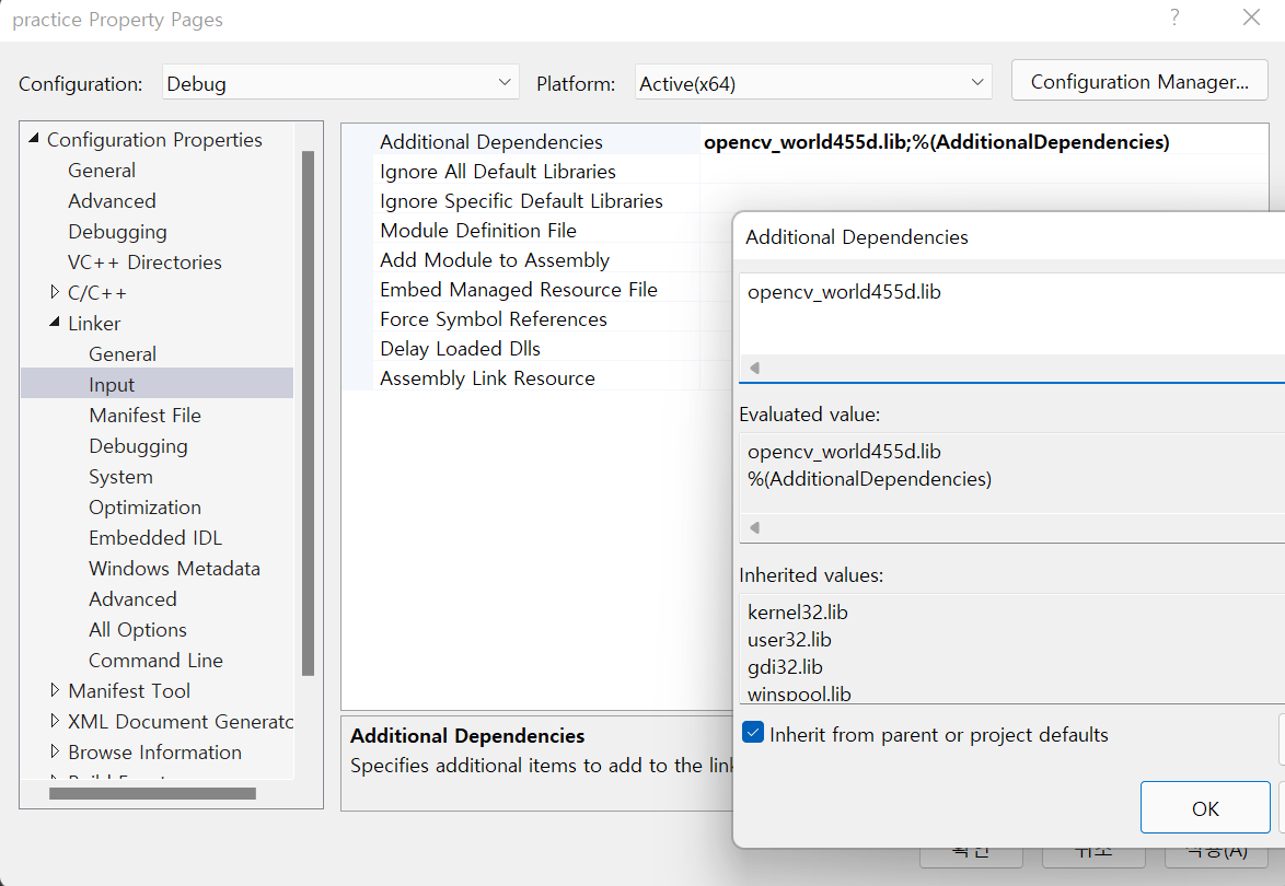 마지막으로 Linker - Input의 Additional Dependencies의 Edit을 눌러서 OpenCV 라이브러리의 이름을 입력합니다. 제가 사용할 OpenCV 라이브러리의 이름은 opencv_world455d.lib이며, 이를 입력하고 확인을 누릅니다.