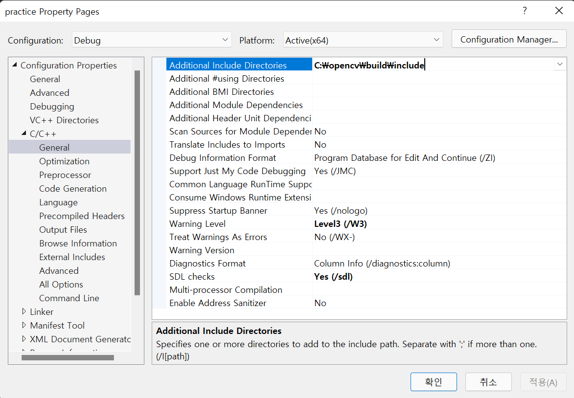 프로젝트 속성의 Configuration Properties - C/C++ - General의 Additional Include Directories에 우리가 설치했던 opencv 폴더 내의 build - include 경로를 추가합니다.