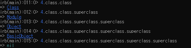 객체는 클래스로부터 만들어지고, 4의 클래스는 Integer입니다. Integer는 Numeric, Object, 그리고 궁극적으로는 BasicObject라는 클래스를 상속합니다.