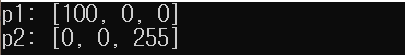 위와 같이 변수를 선언할 경우 p1과 p2는 각각 내부에 uchar val[3]; 타입의 멤버 변수를 가지고 있습니다. p1.val 배열 원소는 모두 0으로 초기화되고, p2의 경우에는 [0, 0, 255]로 초기화됩니다. 만약 p1 변수의 첫 번째 원소를 100으로 변경하고 싶다면 다음과 같이 코드를 작성할 수 있습니다.