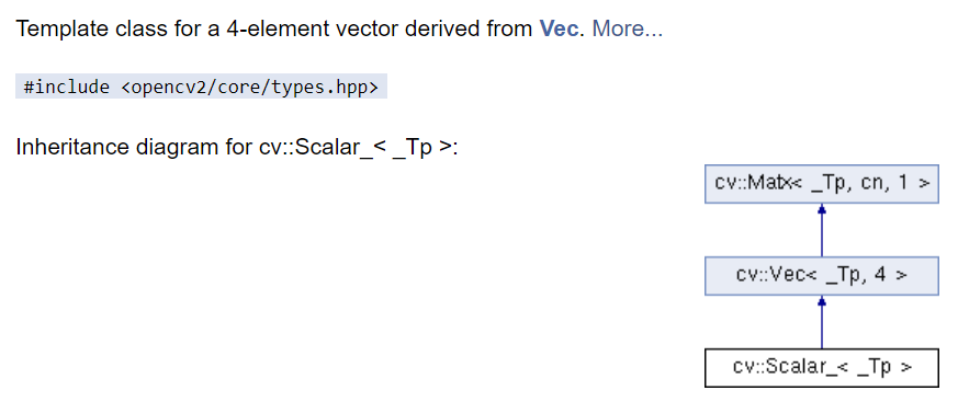 OpenCV에서 Mat 클래스 다음으로 자주 사용되는 클래스는 Scalar 클래스입니다. 이 클래스는 4채널 이하의 영상에서 픽셀 값을 표현하는 용도로 자주 사용됩니다. Scalar 클래스는 Scalar_라는 이름의 클래스 템플릿의 이름 재정의이며 Scalar_ 클래스는 Vec 클래스를 상속받아 정의됩니다. 아래 코드는 Scalar_ 클래스를 간단하게 보여줍니다.