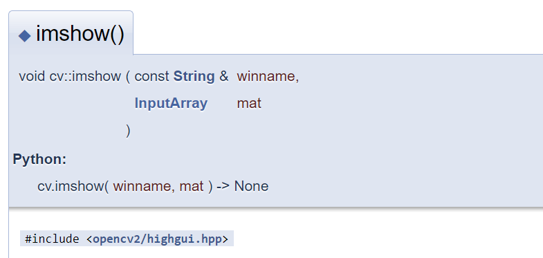 OpenCV 문서를 살펴보면 InputArray 타입의 인자를 사용하는 함수를 많이 볼 수 있습니다. 화면에 이미지를 출력해주는 imshow() 함수도 영상을 InputArray 타입으로 전달하도록 선언되어 있습니다.