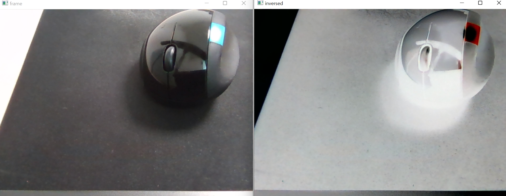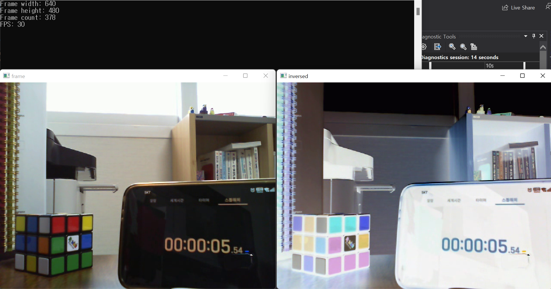 이렇게 프레임을 받아 왔다면 이후 각 프레임에 대한 다양한 영상 처리 기법을 적용할 수 있습니다. 예를 들어, 카메라의 매 프레임에 대해 영상의 반전을 수행하고, 그 결과를 화면에 같이 출력할 수 있습니다.