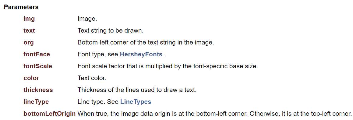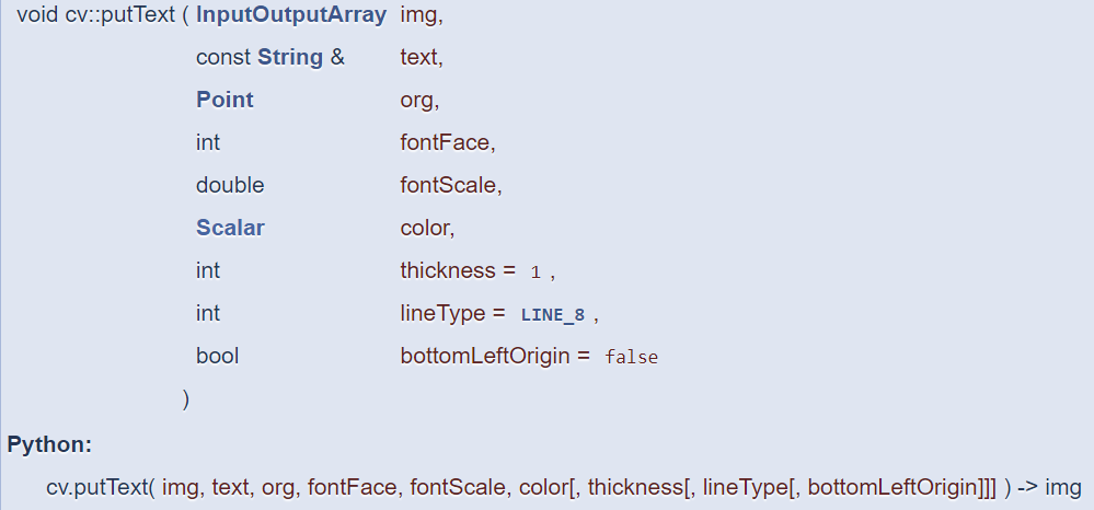cv::putText(img, text, org, fontFace, fontScale, cv::Scalar(255, 0, 0), thinkness);