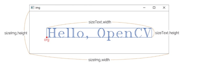 OpenCV는 문자열 출력을 위해 필요한 사각형 영역 크기를 가늠할 수 있는 getTextSize() 함수도 제공합니다. 이 함수를 잘 이용하면 문자열이 한쪽으로 치우치지 않고 적당한 위치에 출력되도록 설정할 수 있습니다.