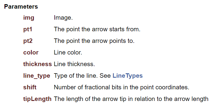 arrowedLine() 함수는 img 영상 위에 pt1 좌표부터 pt2 좌표까지 직선을 그리고, 끝점인 pt2에 화살표 모양의 직선 두 개를 추가로 그립니다. 이때 화살표 모양의 직선 길이는 arrowedLIne() 함수의 마지막 인자 tipLength를 이용하여 조절할 수 있습니다. tipLength 인자는 기본값으로 0.1이 지정되어 있는데, 이는 직선 전체 길이의 0.1에 해당하는 길이로 화살표를 그리라는 의미입니다.