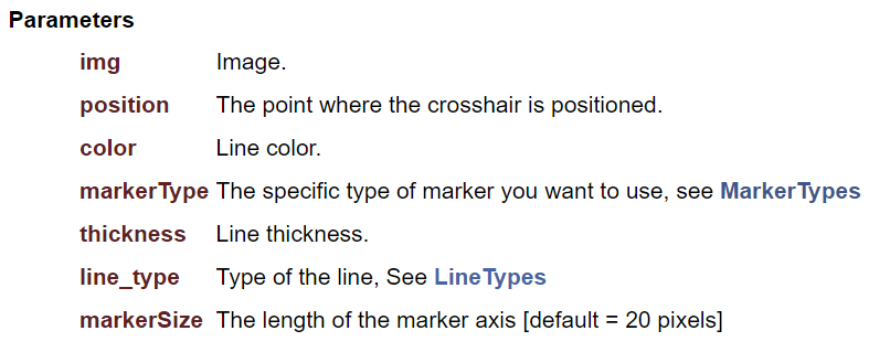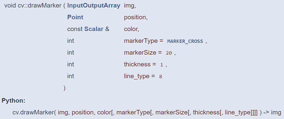 drawMarker() 함수는 img 영상의 position 좌표에 color 색상을 이용하여 마커를 그립니다. 마터 종류는 markerType 인자로 지정할 수 있으며, 기본값으로 십자가 모양을 의미하는 MARKER_CROSS가 지정되어 있습니다. 만약 다른 종류의 마커를 그리고 싶다면 markerType 인자에 MarkerTypes 열거형 상수 중 하나를 지정할 수 있습니다.