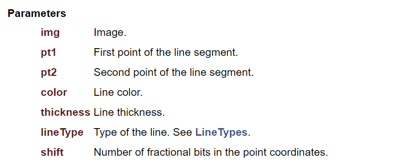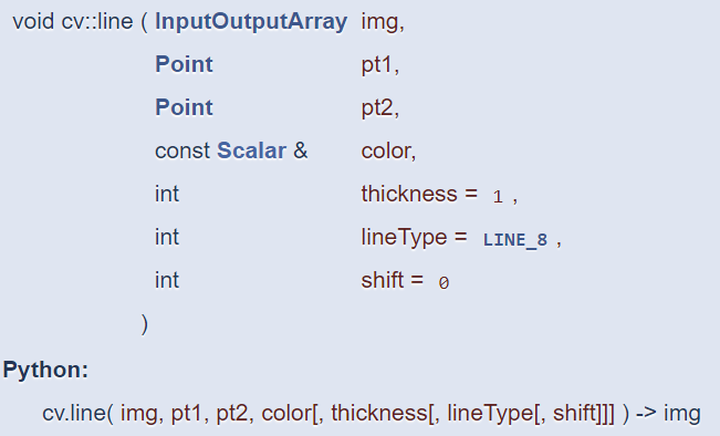 가장 먼저 살펴볼 그리기 함수는 영상 위에 직선을 그리는 line() 함수입니다. 이 함수의 원형은 다음과 같습니다.